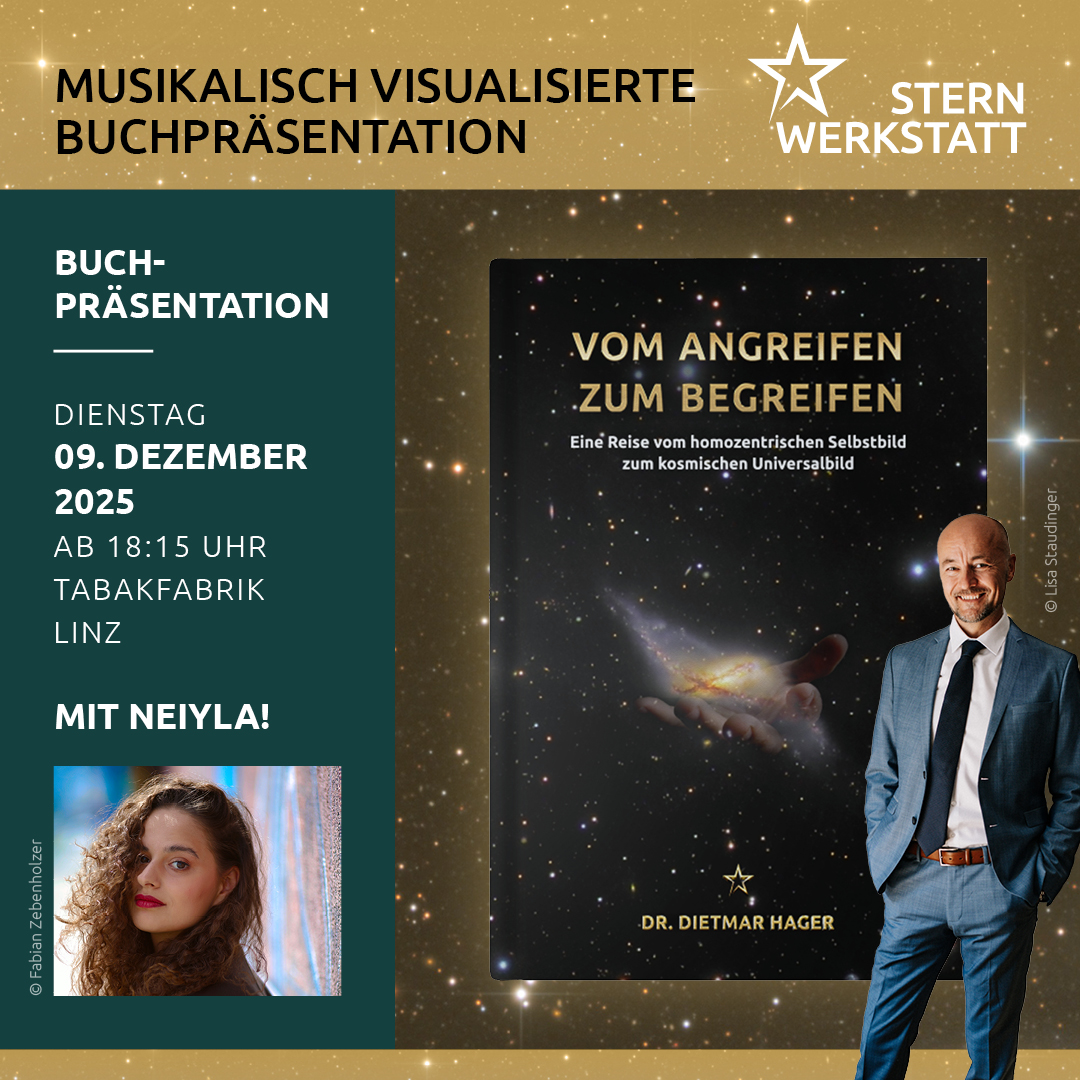 Dr. Dietmar Hager, Arzt, Astrofotograf und Kurator des Ars Electronica Center Linz, präsentiert sein neues Werk „Vom Angreifen zum Begreifen“ – ein Buch, das berührt, inspiriert und den Blick auf das Sehen, Fühlen und Verstehen unserer Welt erweitert.