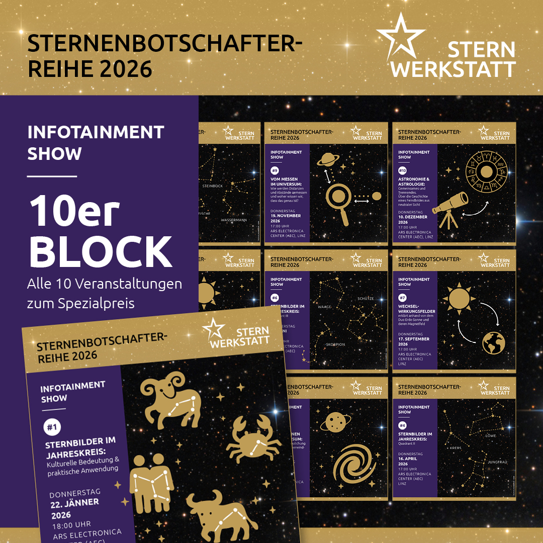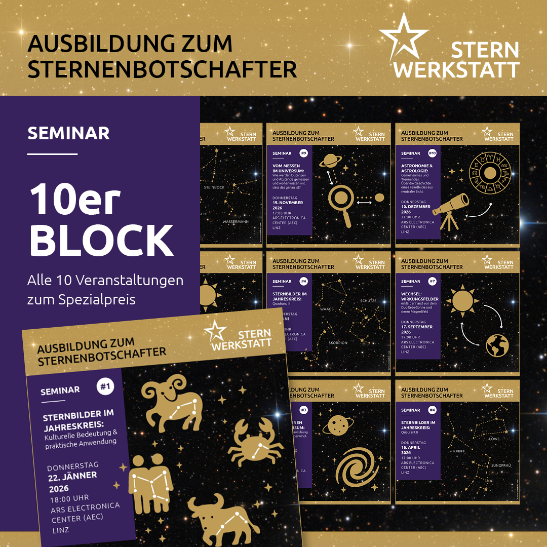 Mit dem Sternenbotschafter 10er Block sicherst du dir den Zugang zu allen Veranstaltungen-Erlebnisabenden der Sternwerkstatt – inklusiv Wissensimpulsen, Mythologie-Geschichten und exklusiven Einblicken hinter die Kulissen des Universums.